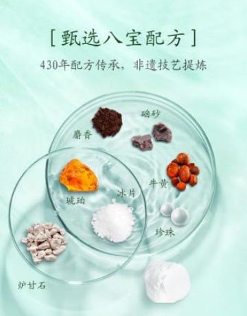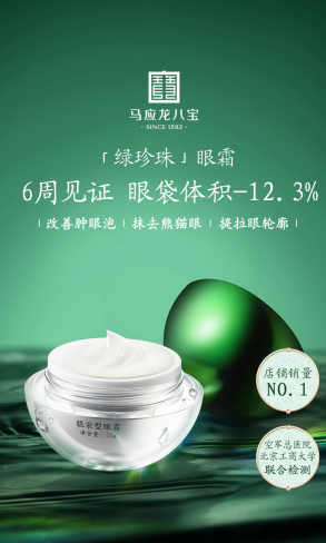 甄选八宝配方中的核心成分冰片、珍珠粉,加入天然抗氧衰老剂—牛油果树果脂,核桃仁提取物对抗黑色素,当归活血化瘀,珍珠粉提亮眼周。北京工商大学空军总医院植物实验室对30名成年人进行42天的产品测试发现:使用6周后,眼袋体积减少12.3%,黑色素含量减少8.17%。